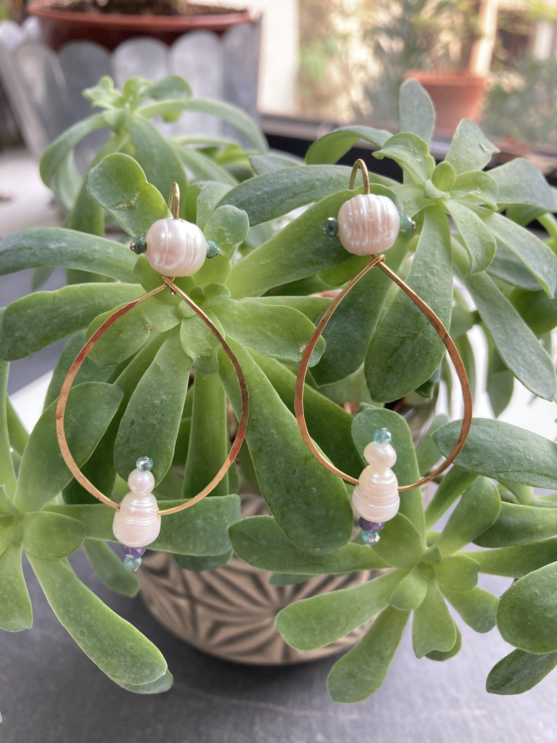 Boucles d’oreilles en fil de laiton martelé , perles d’eau douce et perles de verre.