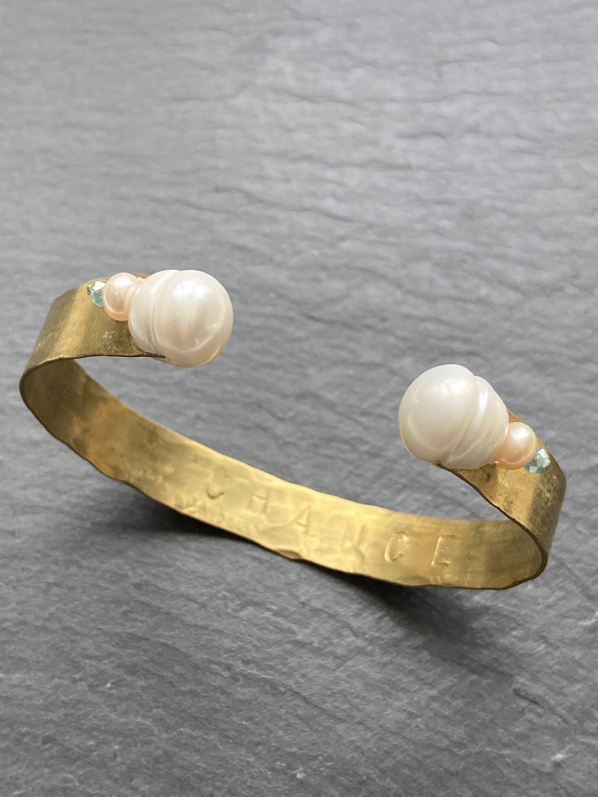 Bracelet en laiton martelé, perles d’eau douce grises et champagnes épinglées de perles de verre.
